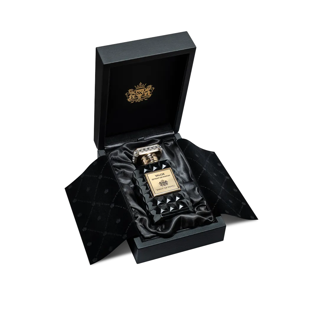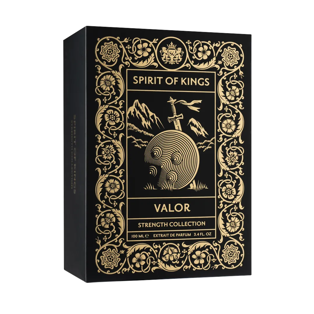 This fragrance symbolizes the bravery, strength, and nobility that define courageous leadership, as well as the sweet rewards and enduring comfort that come with acts of valor. The amber in Valor Extrait de Parfum symbolizes the core strength and resilience required for the royalty. Its rich and powerful scent evokes the enduring courage and steadfastness of kings and queens who lead with bravery. The caramel notes represent the sweet reward and admiration that come with acts of valor.